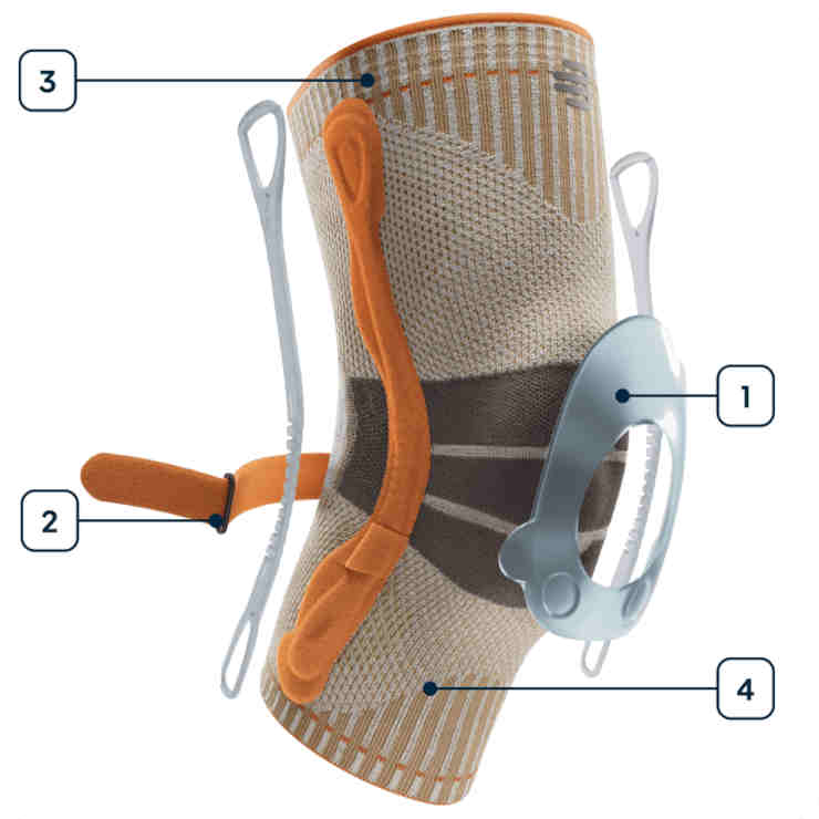 Durch individuell einstellbare Gurte kann der vordere Gelenkapparat sowie die Patellasehne gezielt entlastet werden – besonders hilfreich bei hoher Belastung, etwa beim Abwärtsgehen oder Sport. - Core Yarn Technology